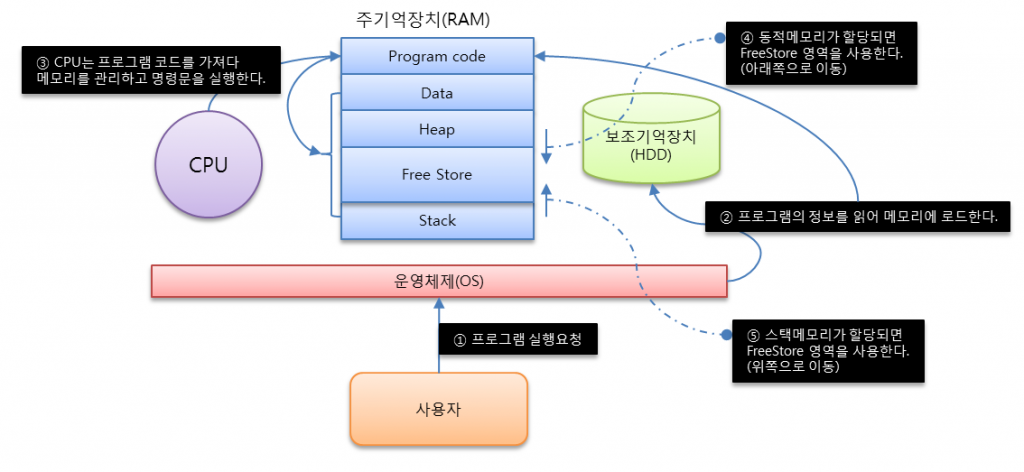 이 공간에 메모리 할당하는 것을 동적 할당(Dynamic Memory Allocation)이라고도 부른다.