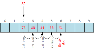 이 경우에는 특정 해시 값의 주변이 모두 채워져 있는 일차 군집화(primary clustering) 문제에 취약하다.