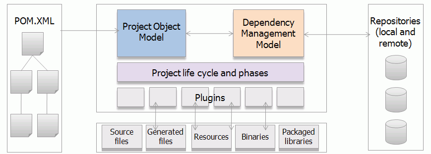 프로젝트 객체모델(Project Object Model: POM) 이라는 개념을 바탕으로 프로젝트의 의존성관리, 라이브러리관리, 프로젝트 라이프사이클 관리 기능등을 제공하는 프로젝트 관리도구이다. 플러그인을 기반으로 소스코드로부터 배포 가능한 산출물을 만들어내는 빌드 기능을 제공한다.