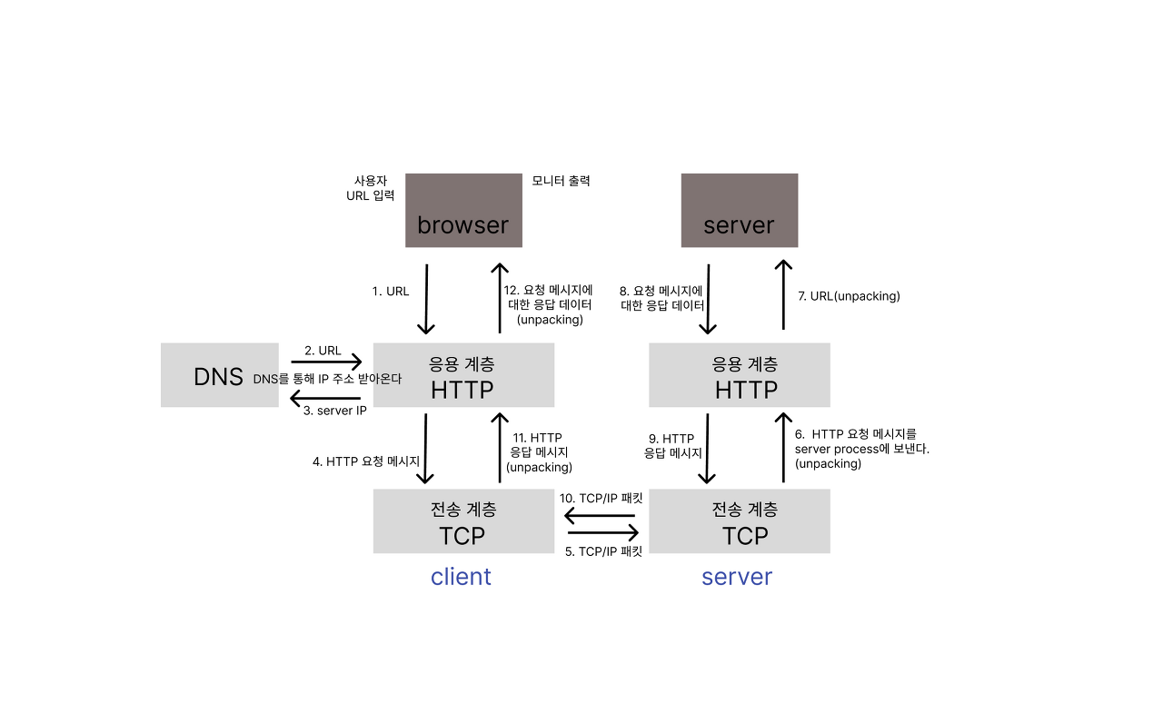 - 브라우저는 server IP에게 자료를 요청하는 HTTP request message를 만들고 TCP/IP 패킷을 생성한 이후 서버로 전송 요청을 한다.