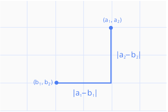 아래 그림과 같은 개념으로 이해하면 쉽다. 실제로 맨하탄 거리라는 이름도 도시의 골목길(블록)을 걸을 때의 모습과 유사하기 때문에 붙은 거라고 한다. (a에서 b로 이동할 때 몇 블록 이동하는지 상상해보자.)
